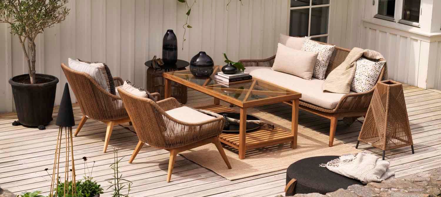 Tänk er sommar, tänk er sol. En skön plats, delvis i skugga, att verkligen kunna njuta av stunden. Hassel utesoffa och Hassel fåtölj gör sig bra i många miljöer, som här på ett patinerat trädäck. Hassel har vi designat i en varm och inbjudande stil, som förstärks av kombinationen med sits i flätad konstrotting och stomme i teak. Konstrottingen är flätad för hand och tack vare sin twistade form ger den en extra naturlig och mysig känsla. Sittdynor ingår till både fåtölj och soffa. Du kan sedan på egen hand variera utseende genom att styla med de ryggkuddar du gillar.