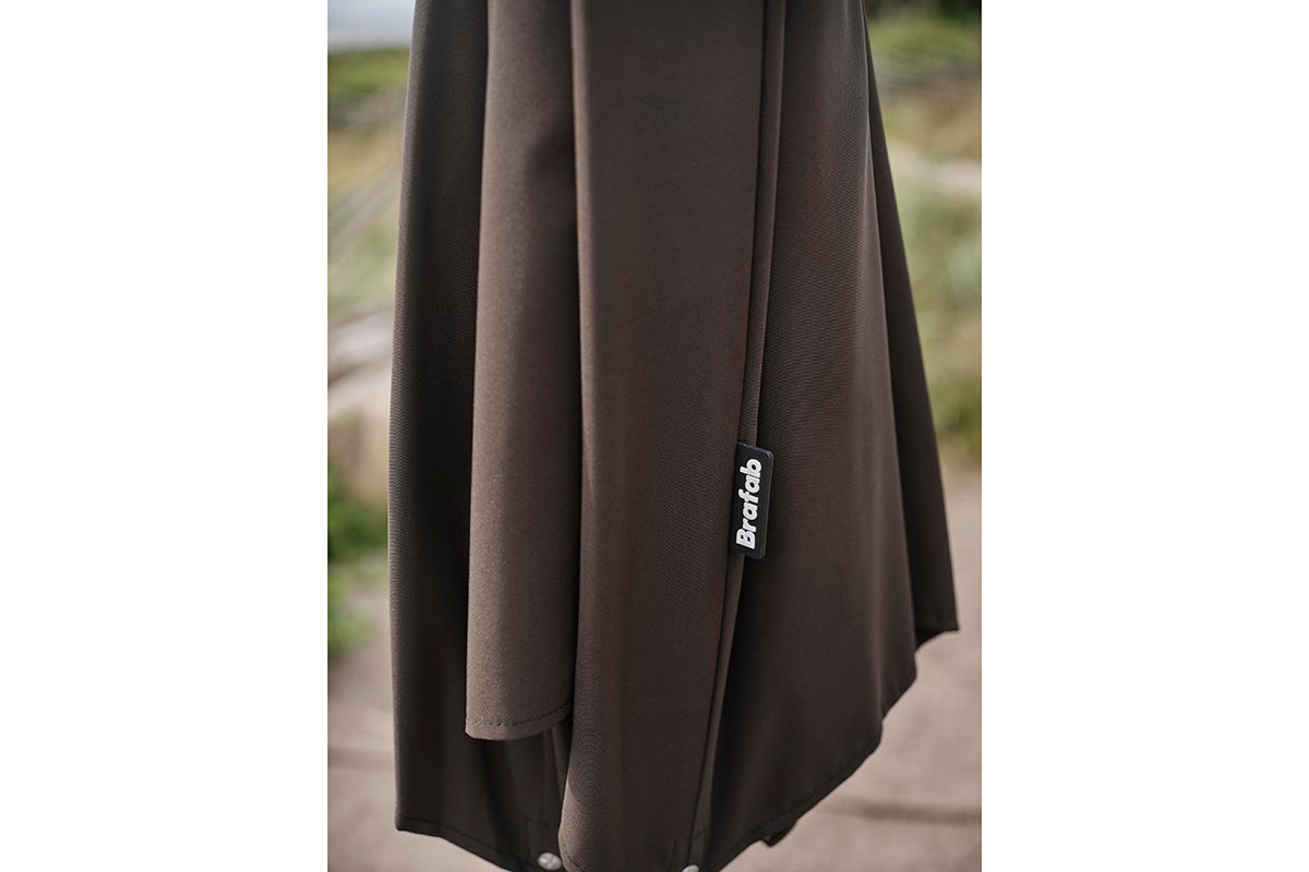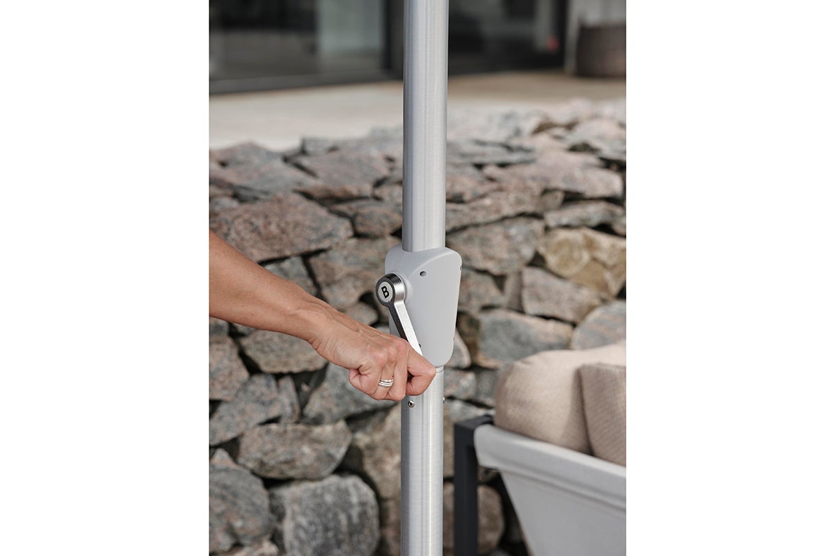Abriola har en silverfärgad aluminiumstång i två delar med en diameter på 48 mm. Stången är utrustad med en vev och en automatisk tiltfunktion, vilket gör det enkelt att vinkla parasollen. Parasollens tak är tillverkat av 250-grams lösningsfärgat tyg, komplett med en ventilationsöppning, och stöds av 8 ribbor.