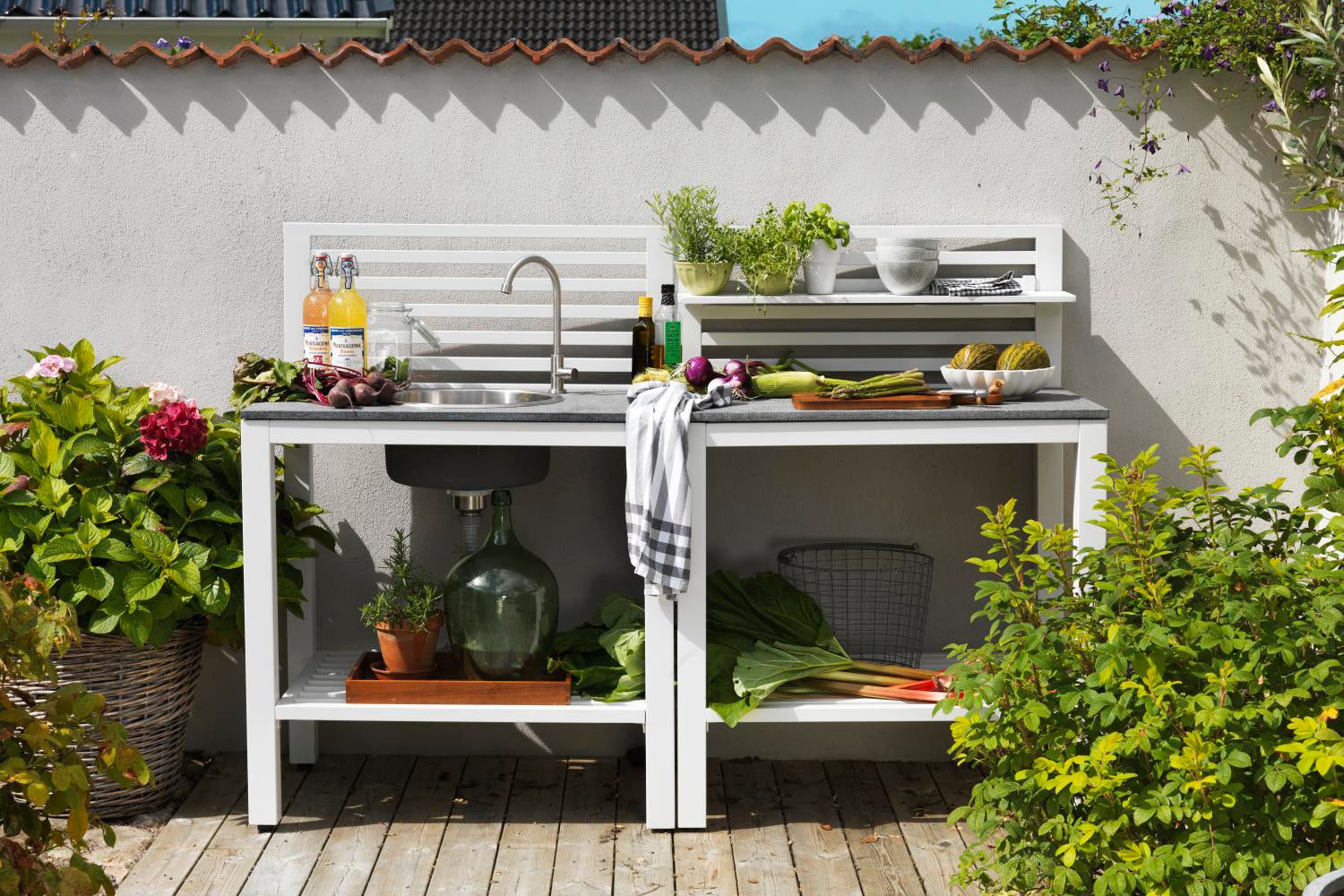 Ta med vännerna till uteplatsen för att förbereda och laga maten på plats! Bellac utekök i mattlackerad aluminium, stenskiva, kran och vask gör det möjligt! Finns i vitt, antracit och svart. Alla med grå stenskiva.