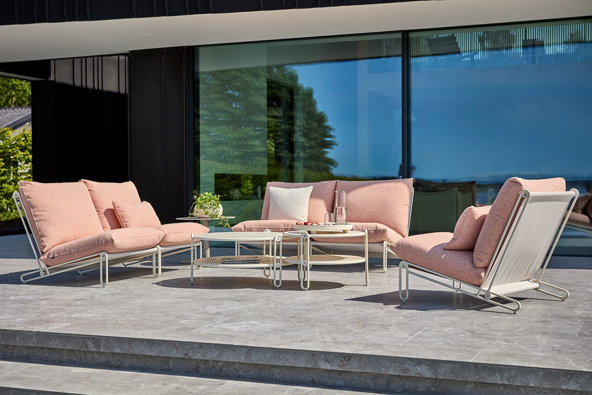 Modern byggbar soffa/stol i loungestil med aluminiumstomme och sits i textilene. Bekväma dynor klädda i mjukt olefintyg med vattenavvisande beläggning. Inbjudande design och hög flexibilitet: bygg antingen en ensitsfåtölj eller en längre soffa med alla sittplatser du behöver. De öppna avsluten gör att man kan sitta även på sidorna. Borden, som kan användas enskilt eller tillsammans, har en perforerad bordsskiva. Det är en snygg designdetalj och dessutom en smart funktion som gör att vattnet rinner igenom.
