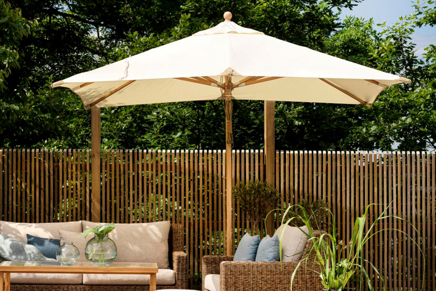 3x3 m parasoll av FSC-märkt trä (Sycamore) med mattlackerad yta. Vackra läderskoningar och väv av 250 g polyester.