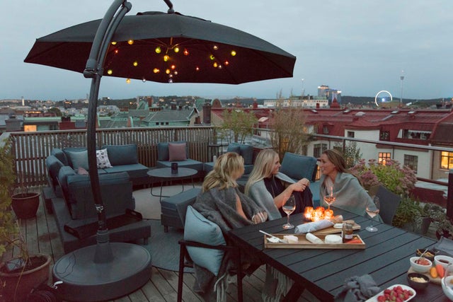 Easy sun är ett maffigt frihängande parasoll med en diameter på 3,75 m. Stativet är av aluminium och kapellet av tålig olefin med vindlucka. Fälls enkelt upp och ned med hjälp av en vev. Foten fylls med sand och/eller vatten för stabilitet.