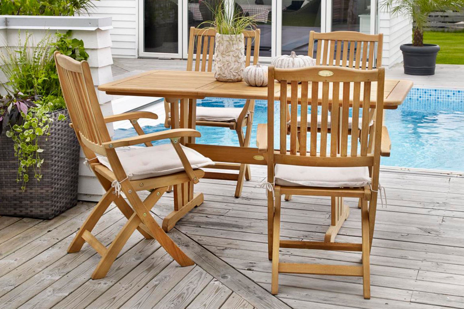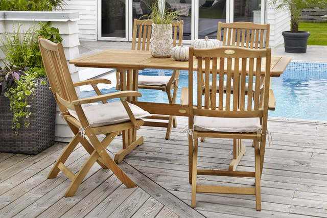 Filippa är tillverkad i naturell teak och finns både som fällstol och karmstol, som även den är fällbar. Du kan snyggt kombinera dem med något av våra teakbord.