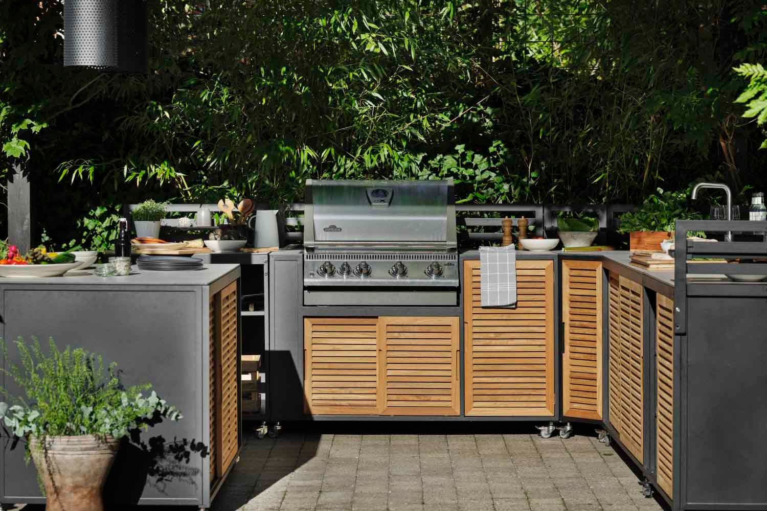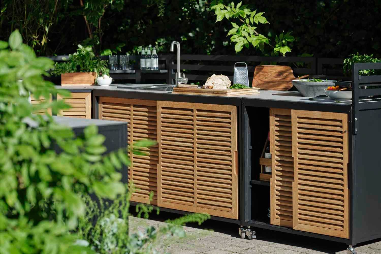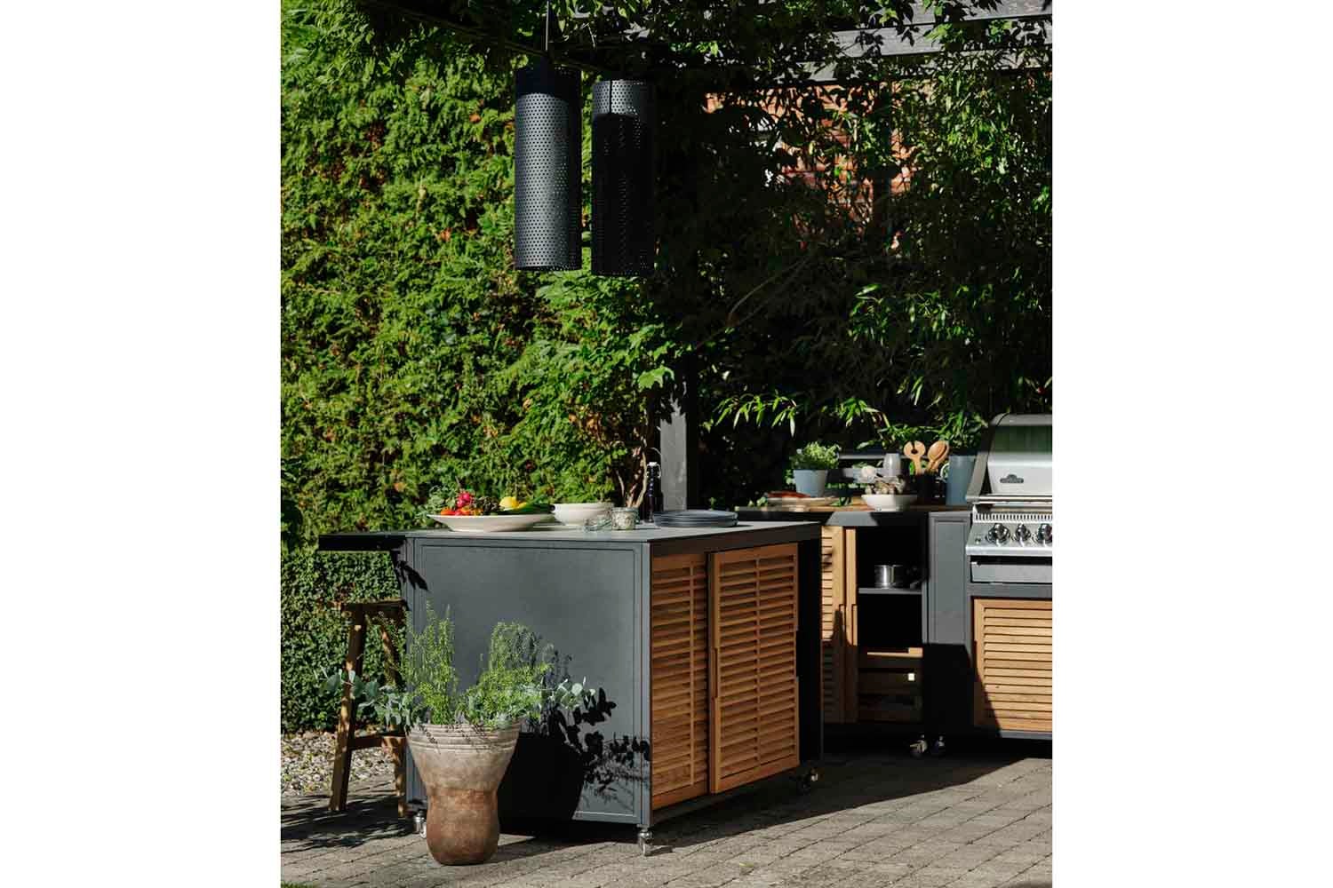 Ett premium utekök i svart aluminium med luckor i teak och topp i högtryckslaminat. Designad för ett modernt boende och med många smarta funktioner. Fornax består av 5 olika enheter som kan sättas ihop på olika sätt till ett komplett och stort utekök. En enhet är förberedd för att lägga till en grill, en enhet har diskho och vattenkran och en enhet har en slät topp, perfekt som arbetsyta. Alla enheter har rejäla hjul, bakdel/staket och hylla. Som tillbehör finns också en skiva (stor och liten) som kan monteras på till en bardisk.