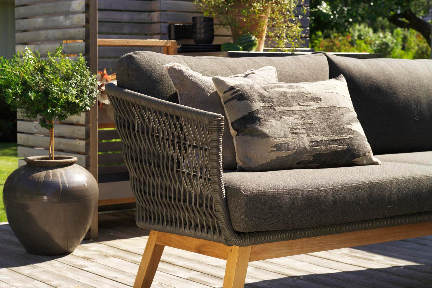 En smakfull kombination av konstrotting och teak, utmärkt i exempelvis ett uterum. Här är konstrottingen glesvävd vilket ger matstolen ett nätt intryck. Den levereras med både sittdyna och en smidig ryggdyna. 3-sits soffan har två tjockare sitt- respektive ryggdynor. Samtliga dynor är klädda i grått olefintyg. Matstolen passar utmärkt till flera av våra matbord i teak och soffan med våra teaksoffbord.