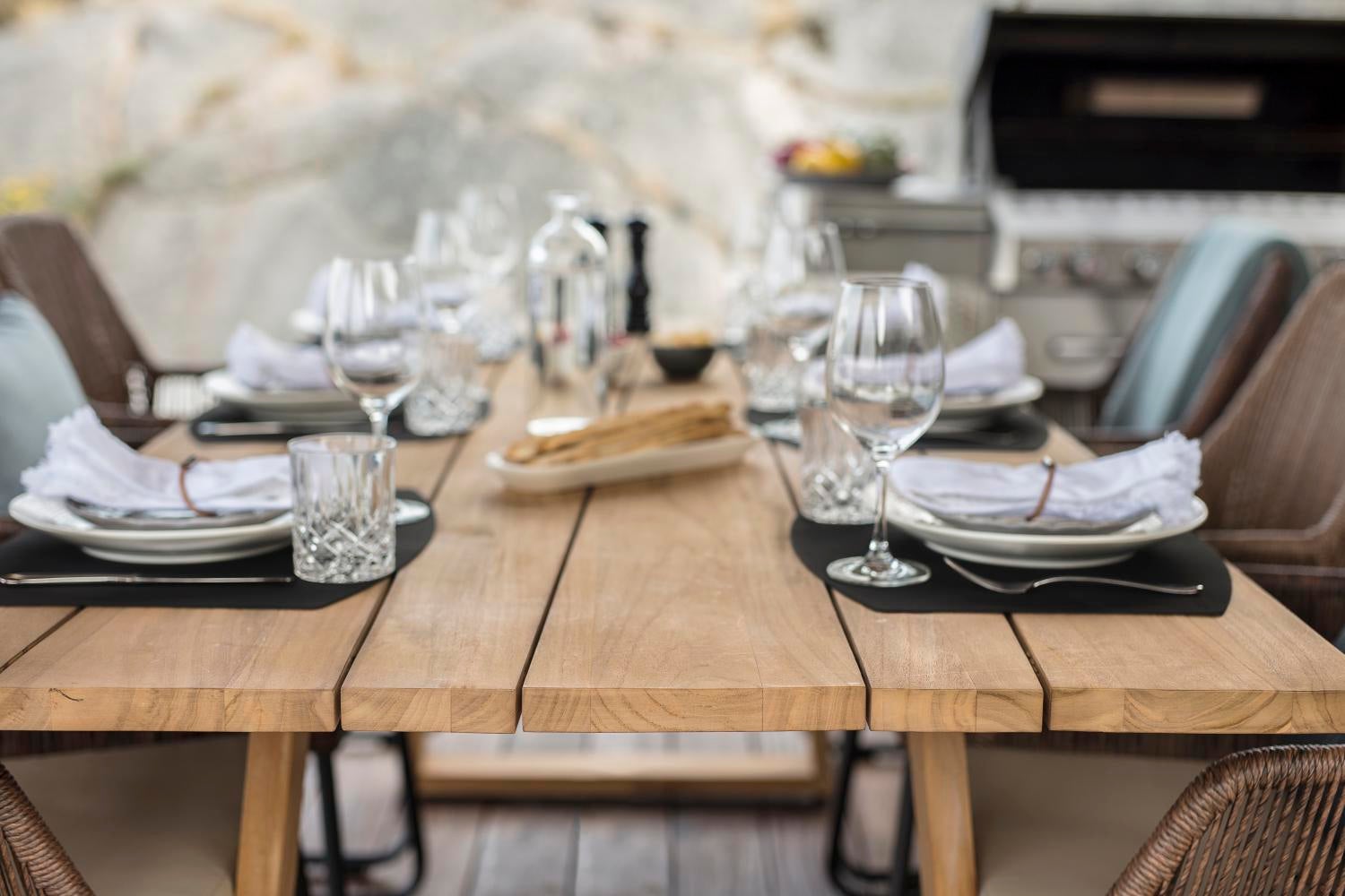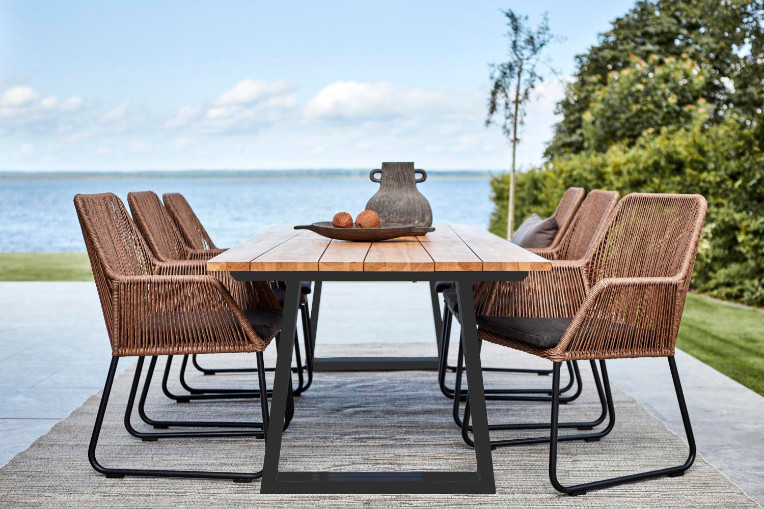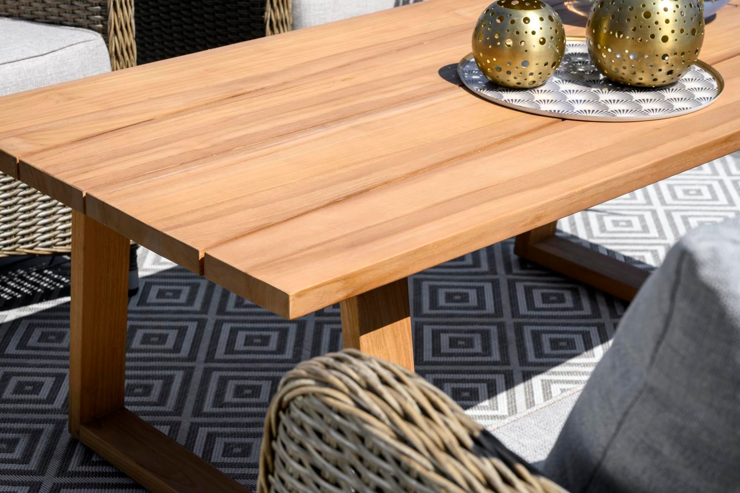 Ett vackert modernt teakbord präglat av en bordstopp i unik design och ett skickligt hantverk. Lättplacerat och generöst.
