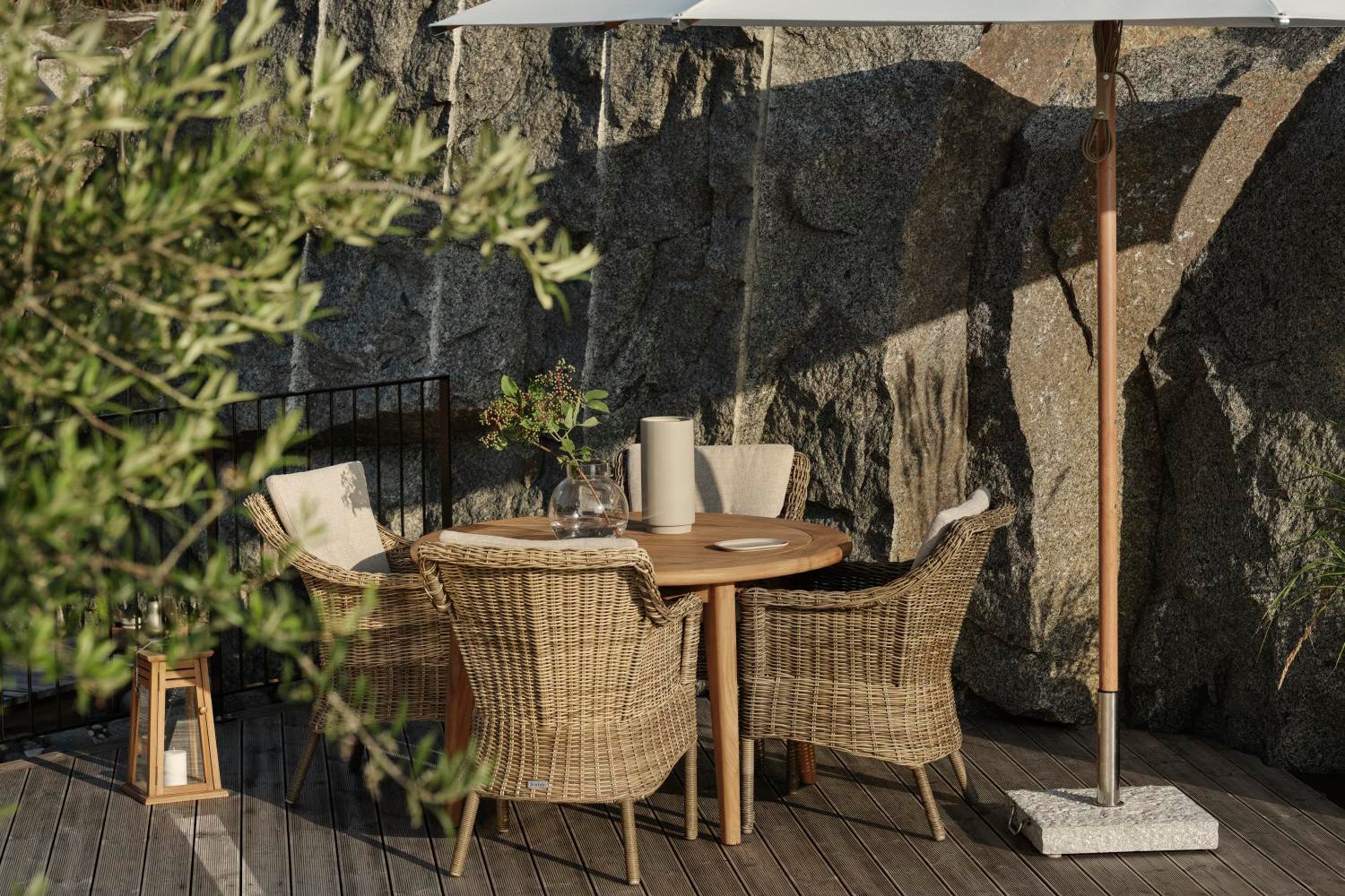 En skön karmstol i rustik stil som passar utmärkt till våra matbord i teak. Levereras med dyna i beige.