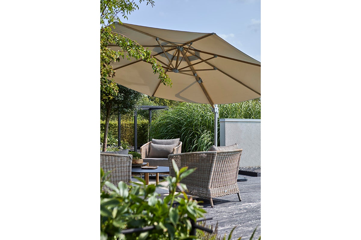 Luzzi parasoll har stomme i sobert ljusgrå. Ribborna är tryckta med ett vackert trämönster, vilket ger en varm om ombonad känsla. Luzzi är ett fristående parasoll med ett 250 g garnfärgat polyestertyg och ett aluminiumstativ med vev och steglös kontroll. Basen är inkluderad men måste förankras med parasollfotsvikter eller liknande.