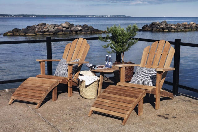 Tänk att över hundra år gammal design håller än. Margariti är tillverkad av noga utvald teak och en modern variant av den älskade Adirondack-stolen. Lägg i en skön pläd eller ett vackert fårskinn, ta med dig en bok och lägg upp fötterna på fotpallen.