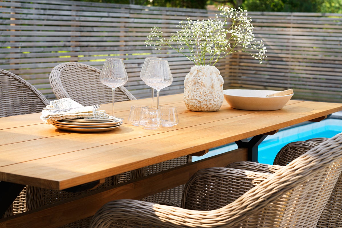 Mark är ett matbord där rustik värme möter industriell känsla. Den massiva teakskivan kombineras med kryssben i aluminium och skapar en kraftfull mix av naturligt och modernt. Justerbara fötter säkerställer stabilitet även på ojämnt underlag.