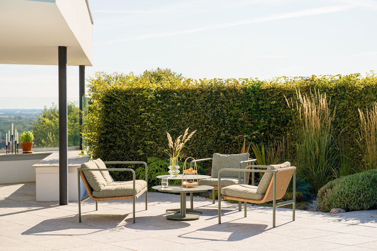 Mjuka former och en naturligt inspirerad rottinglook ger Motty både komfort och stil. Serien finns i färgerna Zin Red, Nordic Green och Black. Den pulverlackerade stommen har mjuka övergångar vid fogar och armstöd, vilket förstärker det eleganta uttrycket. Dynor i mjukt Teddy-tyg fulländar känslan och gör Motty lika inbjudande som bekväm.