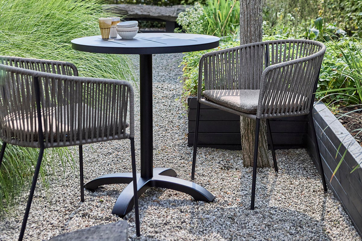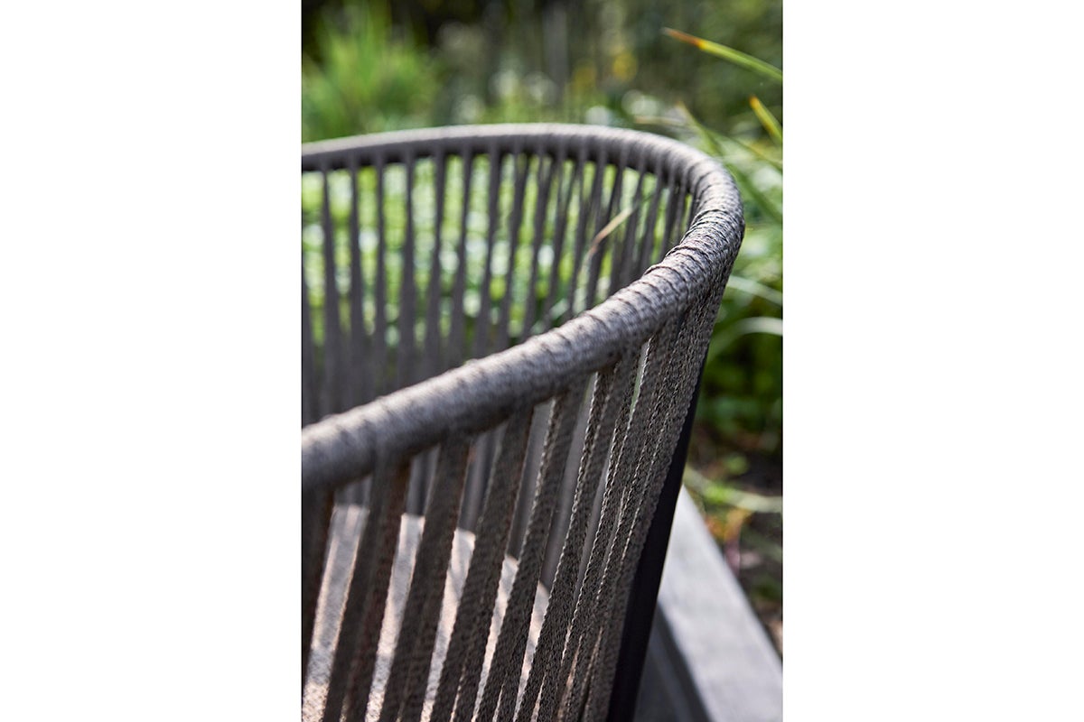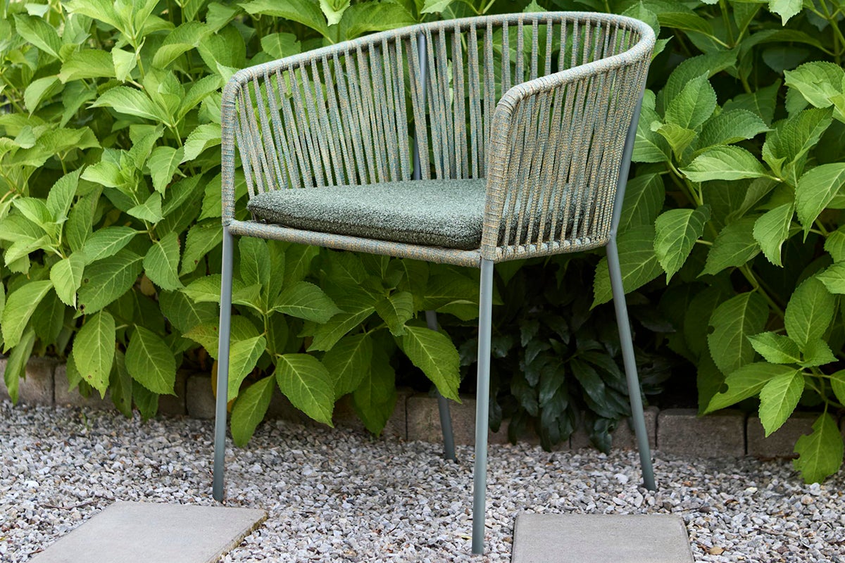 Piatto, matstolen som kombinerar komfort och hållbarhet med sin robusta stålram, designad för utomhusbruk samtidigt som den är vacker och stilren. Sits och rygg är gjord av breda, vävda rep som ger skönt stöd och tillför en touch av hantverksmässig elegans till din utemiljö. Dyna ingår för extra komfort.