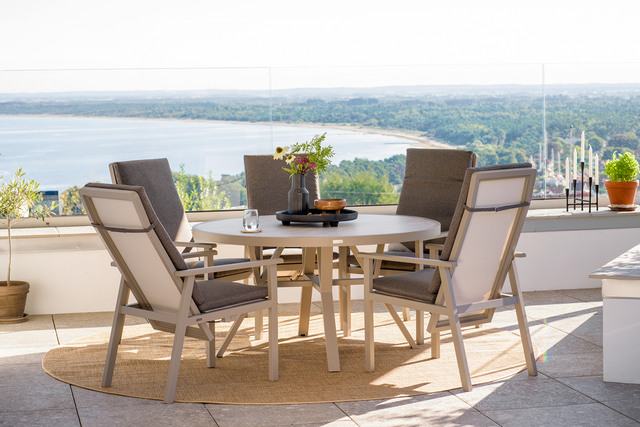 En modern och samtidigt klassisk serie i aluminium som bjuder på en rad kombinationsmöjligheter. De runda och mjuka formerna skapar en trivsam och inbjudande känsla i denna nya serie där detaljerna står i fokus. Finns med stomme i vit, grå eller khaki aluminium.