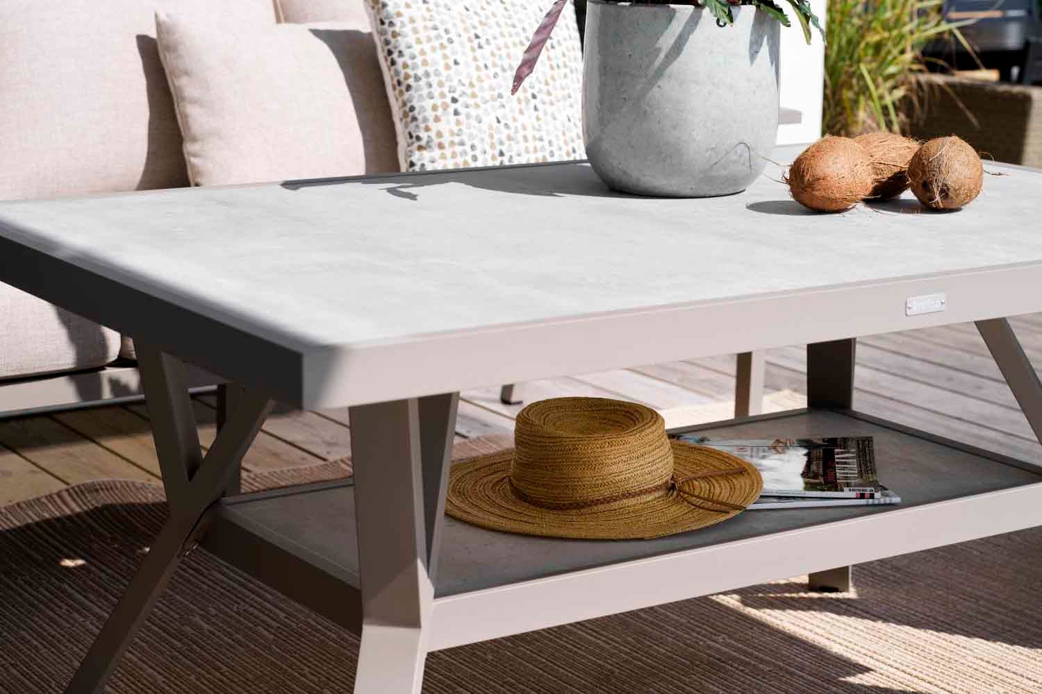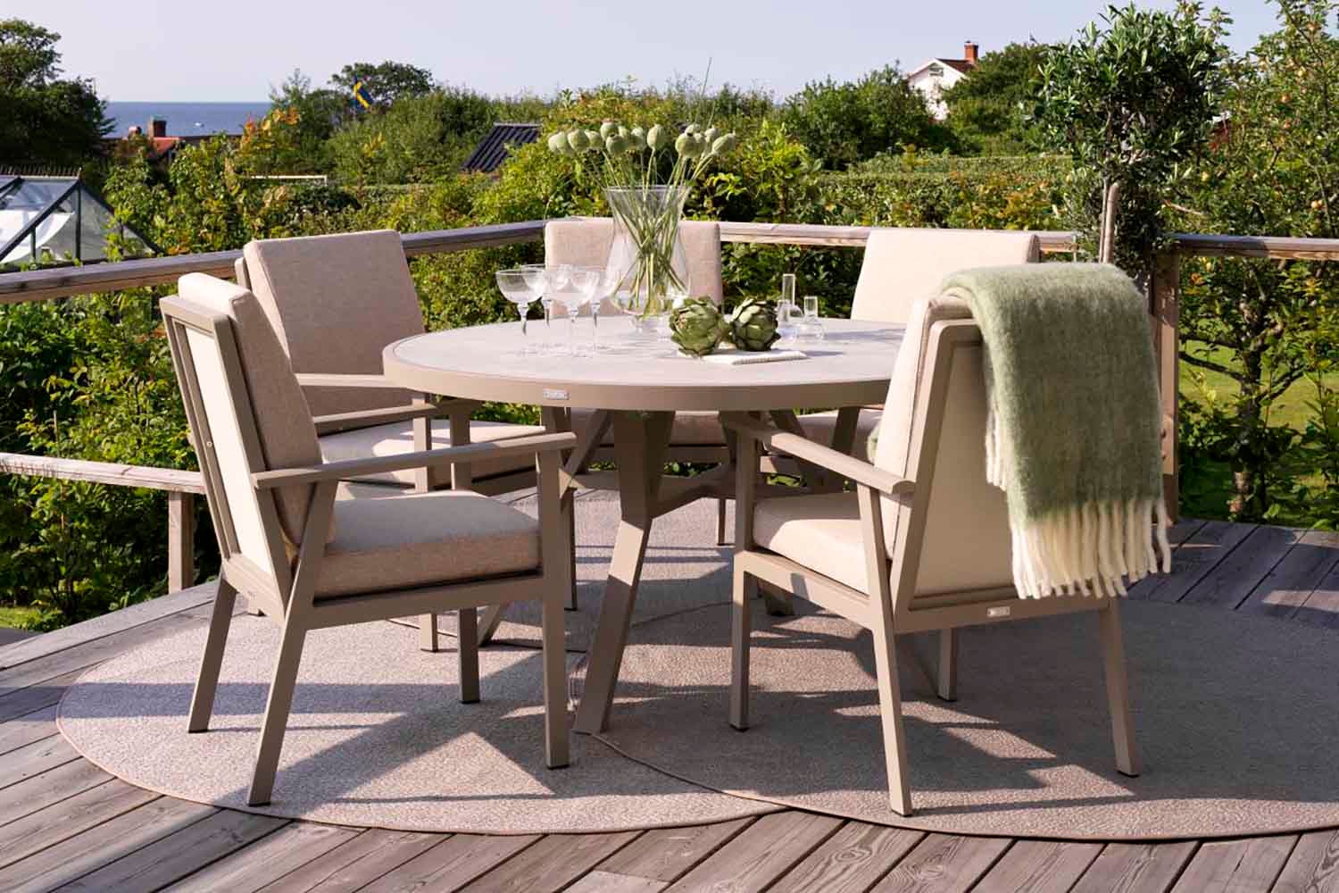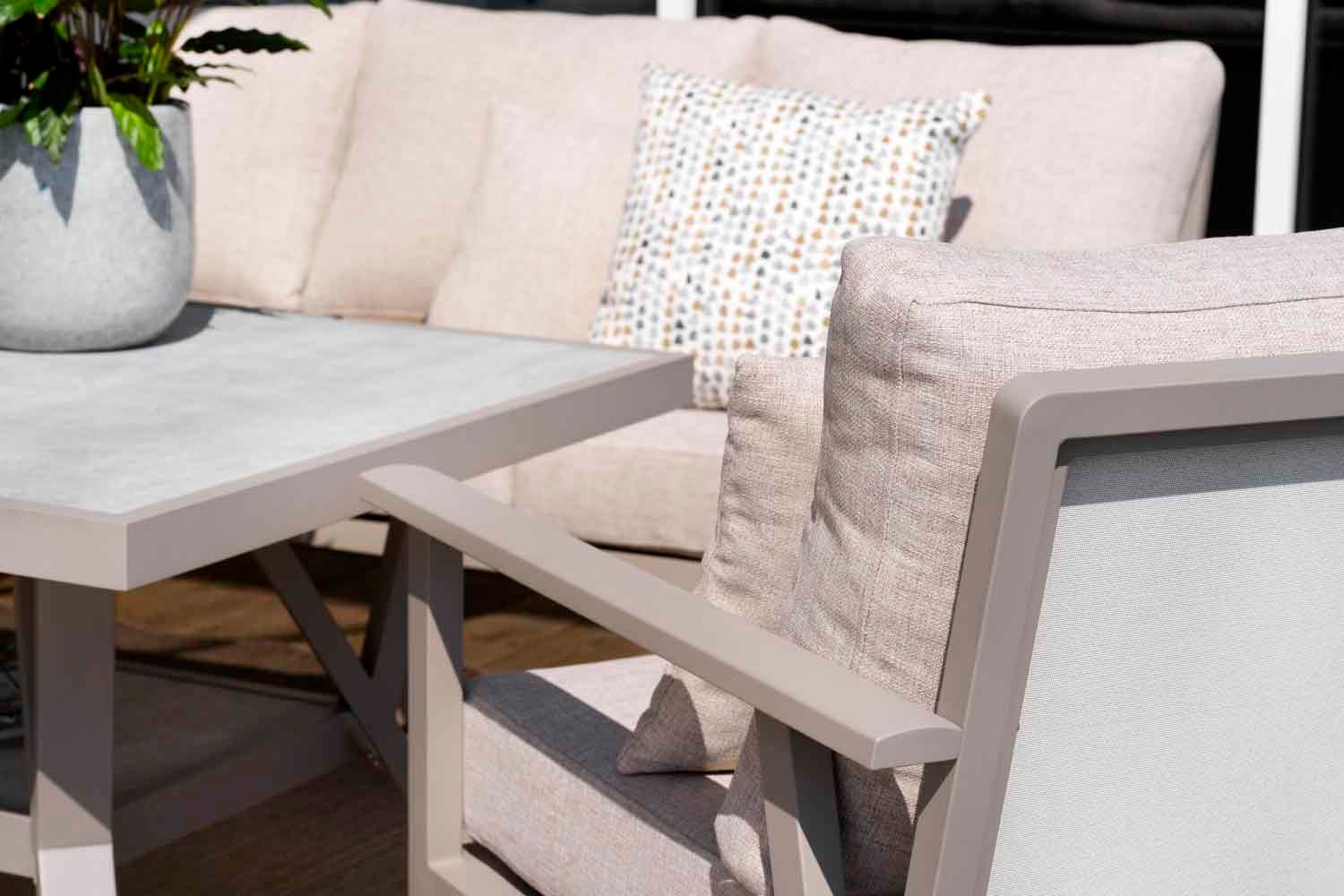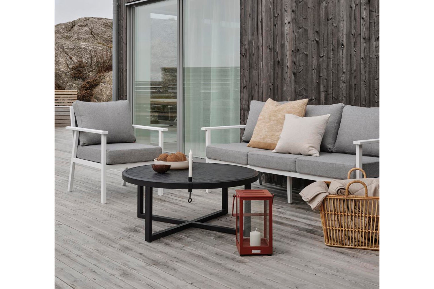 En modern och samtidigt klassisk serie i aluminium som bjuder på en rad kombinationsmöjligheter. De runda och mjuka formerna skapar en trivsam och inbjudande känsla i denna nya serie där detaljerna står i fokus. Finns med stomme i vit, grå eller khaki aluminium.