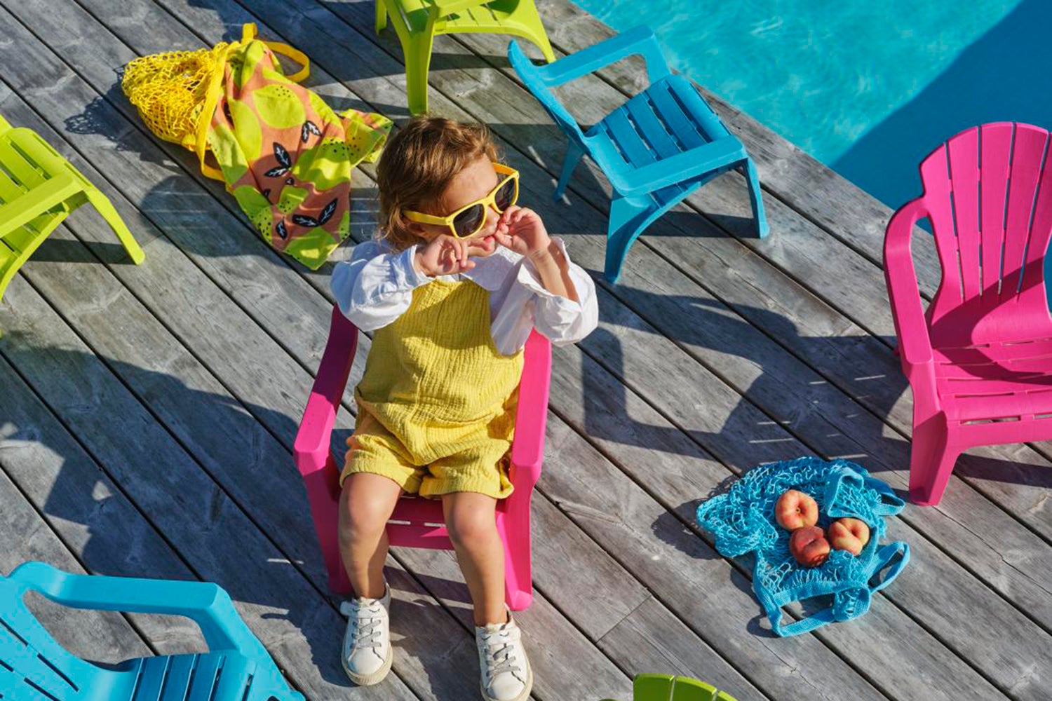 Stapelbar stol i plast i klassisk däckstolsmodell.