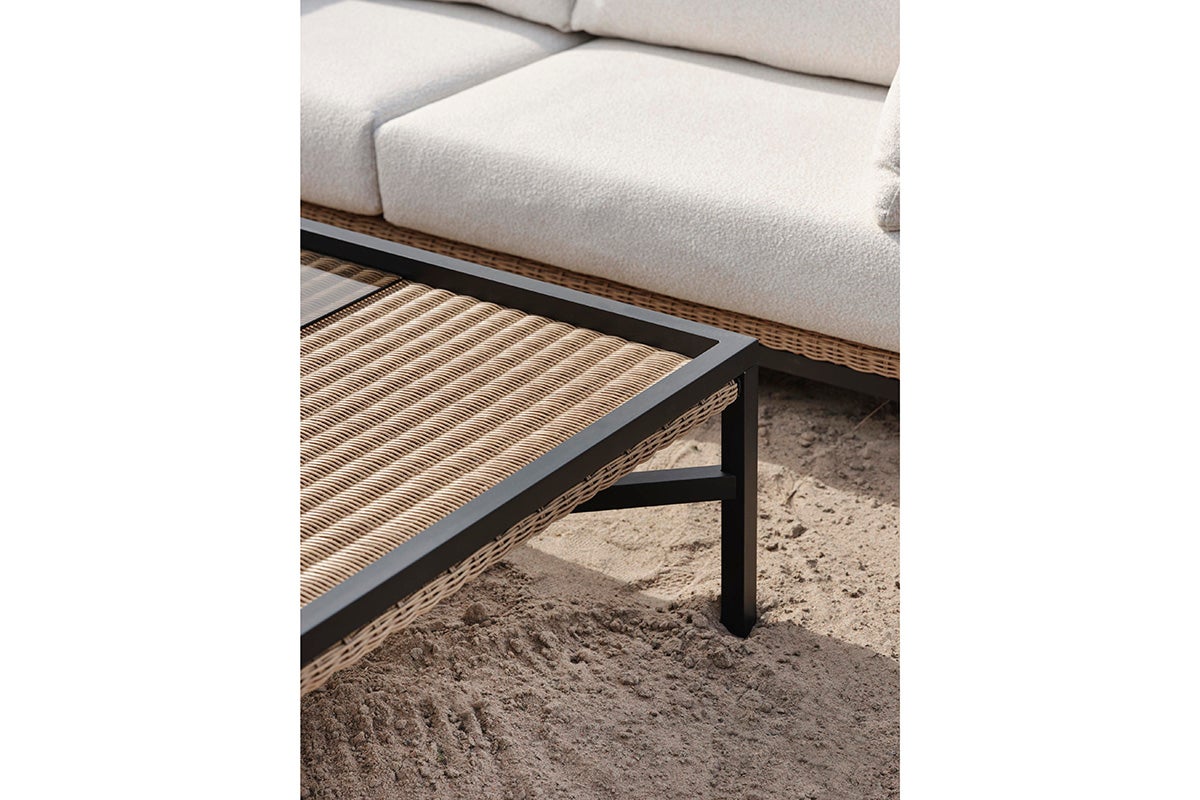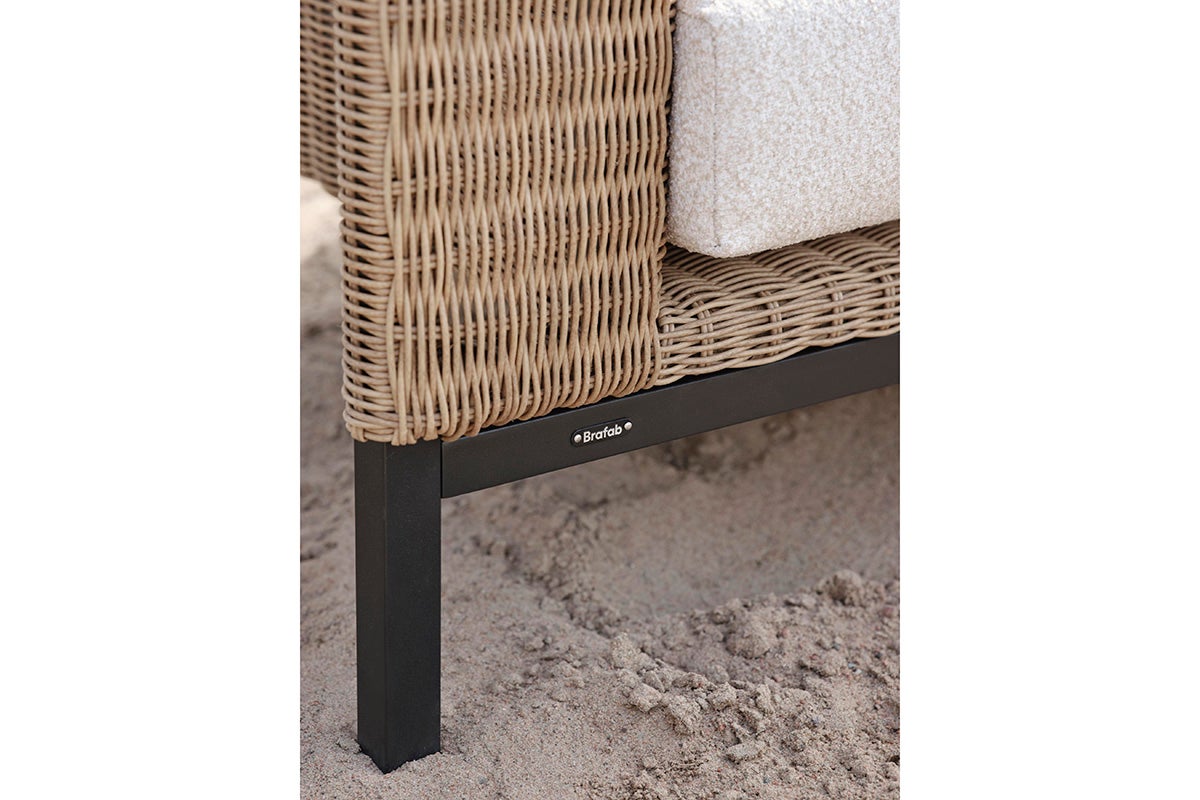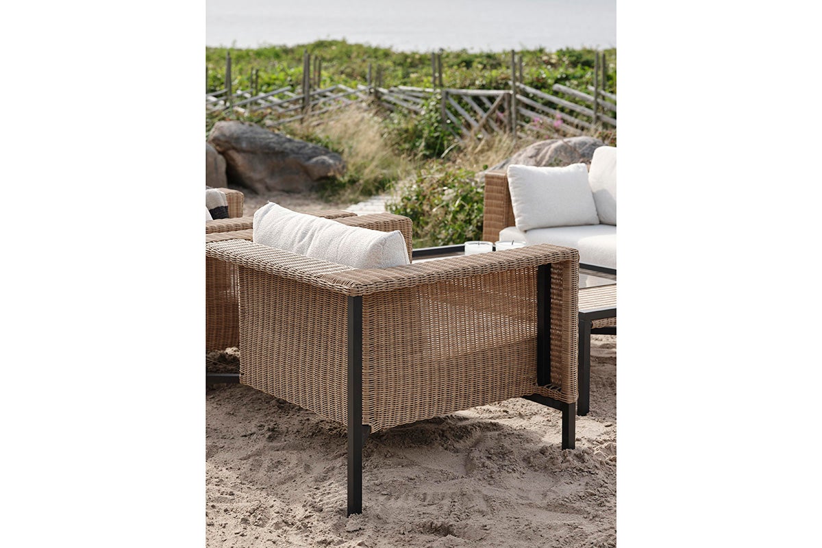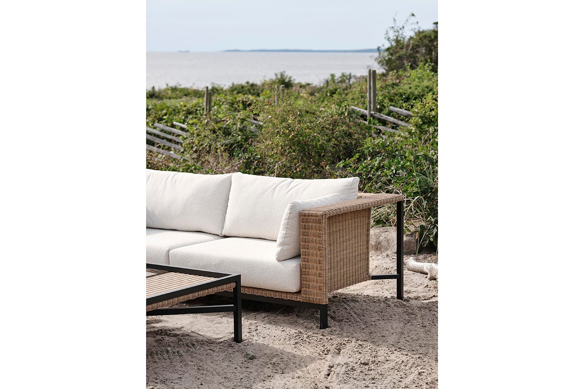 Det som skiljer Shell åt är dess unika blandning av designinfluenser. De rena linjerna och de neutrala färgerna för den lugna enkelheten i skandinavisk design, medan värmen och känslan från konstrotting fångar den avslappnade, soliga känslan från Medelhavet. Denna blandning gör Shell till det perfekta valet för en utomhusoas som är både trendig och tidlös. Den öppna ryggen visar ramen, ytterligare en designdetalj. Ram i svart aluminium och dynor i vitt olefintyg.