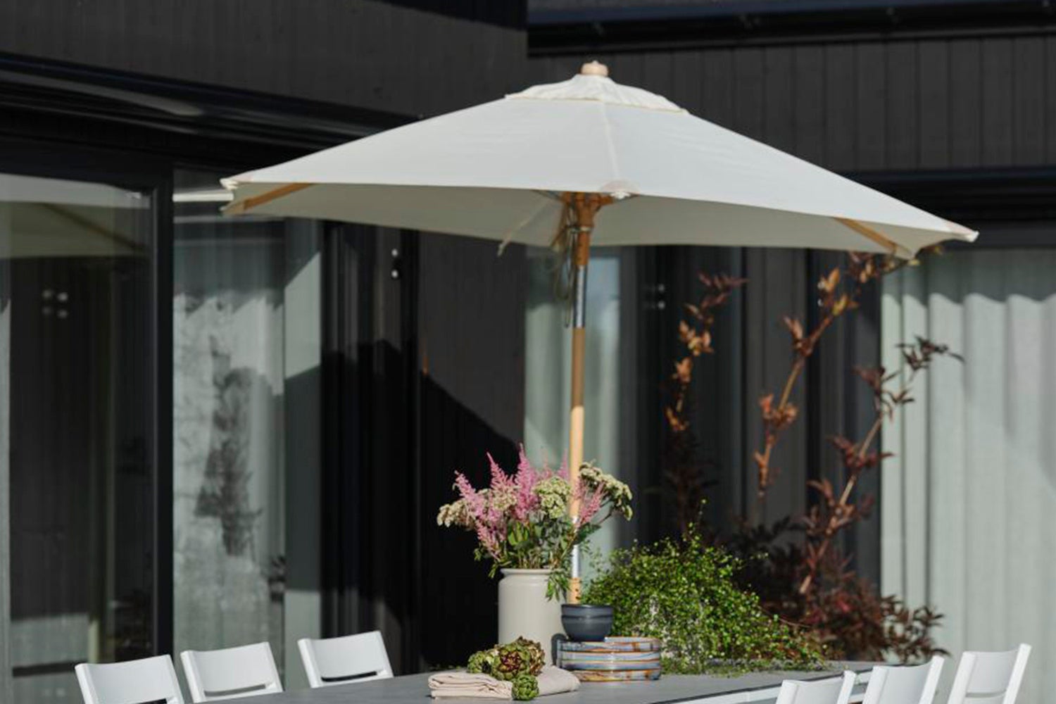 2,5 m parasoll av trä (bok) med mattlackerad yta. 2-delad stång med push-tilt. Vackra läderskoningar och väv av 250 g polyester.