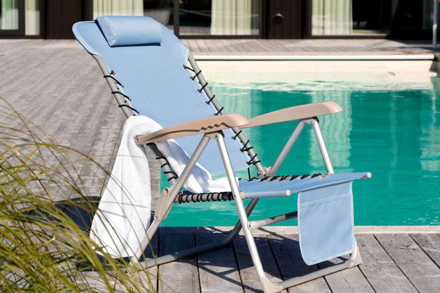 Nätt och stapelbar strandstol med aluminiumstomme och slitstark polyester. Ficka framtill.