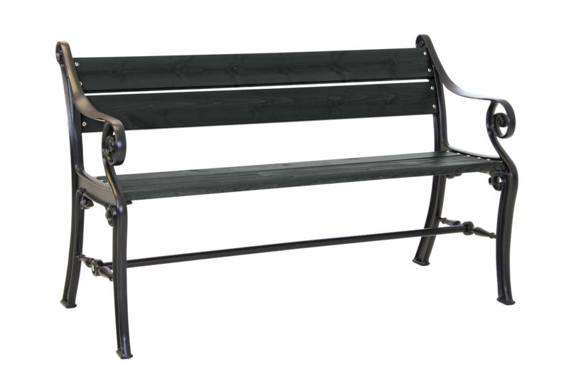 Klassisk trädgårdssoffa med dekorativa gavlar i svartlackad gjuten aluminium kombinerad med vacker brunimpregnerad furu i sittdelen.